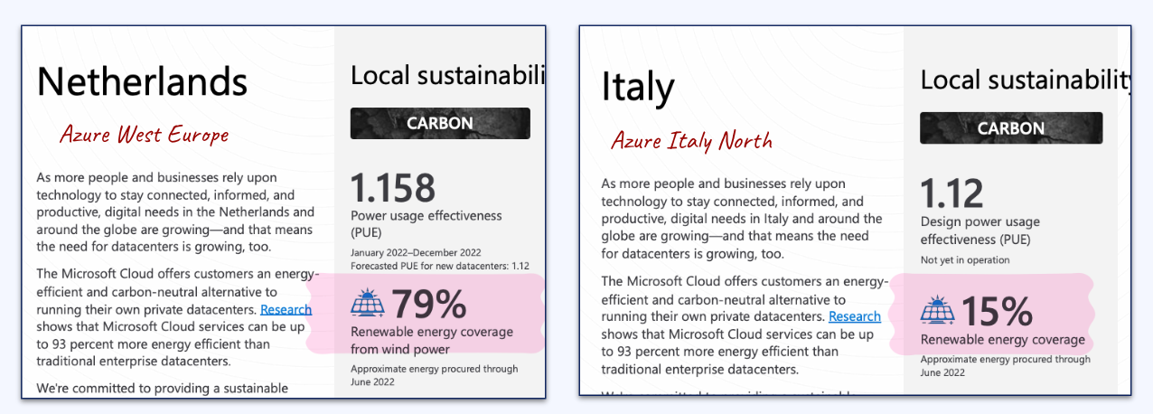 Source: Azure data centers sustainability fact sheets. Azure has since removed these fact sheets from their website.