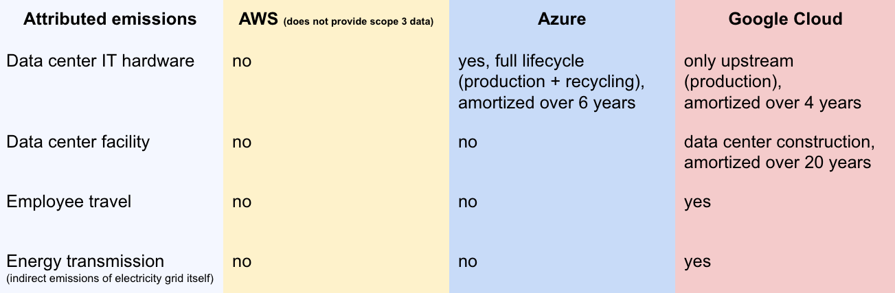 While all hyperscalers have been certified by some third party to report their emissions in accordance with the GHG (for example, Google Cloud’s emission calculation methodology has been reviewed by a company called 3Degrees), the extent of the reported emissions still differs vastly between them. Let’s compare what Google Cloud, Microsoft Azure and AWS include in their calculations.