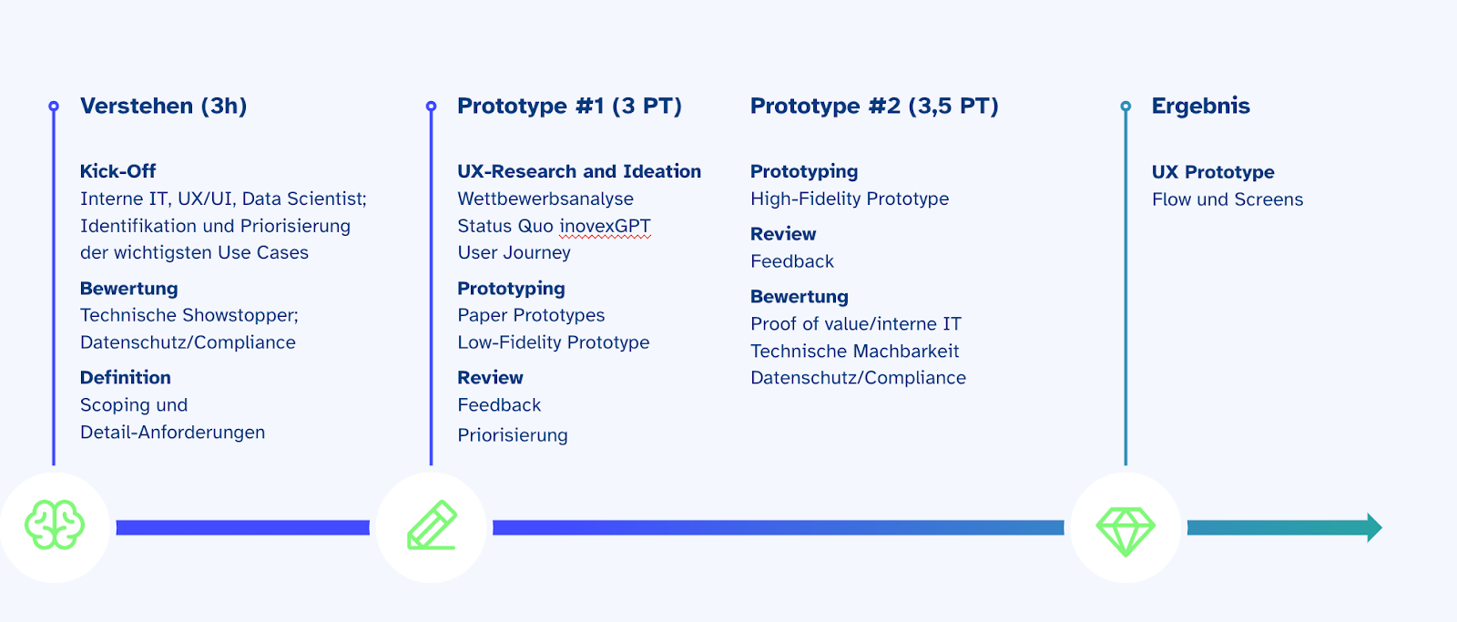 Innerhalb von einer Woche konnte sichergestellt werden, dass ein KI-Assistent für die interne IT nicht nur Mehrwert stiften würde und gut nutzbar wäre, sondern auch technisch realisierbar und compliant ist. Um die Produktrisiken zu reduzieren, wurden gängige Methoden aus der Product Discovery & dem UX-Research angewandt, mitunter User-Interviews und Rapid Prototyping.